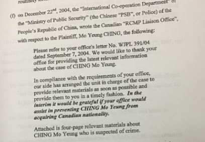 据程慕阳在官司文件中引用的一封信显示,2004年,中国警方要求加拿大警方防止程慕阳获得加拿大公民身份。