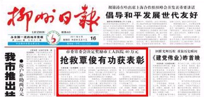 广西柳州重奖抢救县委干部医院 官方称奖金来自
