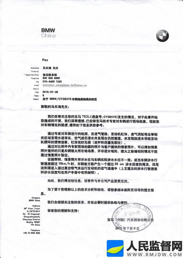 人民监督网记者说:“难道德国宝马汽车是纸糊的?不能见雨水不成?”
