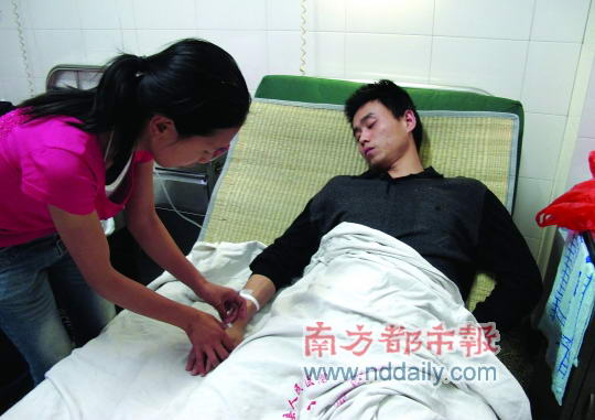 5月13日夜,记者在衡东当地的县人民医院8楼5床见到了正在疗伤的摩托车主曹敏俊,妻子唐玲正陪伴在他身边。曹敏俊今年33岁,曾经在一家物流公司当司机。他说,这两天通过手机上网,了解到有网民传言自己已经死亡一说,自己“很尴尬”。