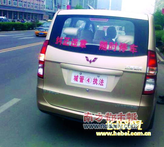 承德城管自制“城管执法”车牌上路,车牌上也有编号,车窗写着“纠正违章 随时停车”。