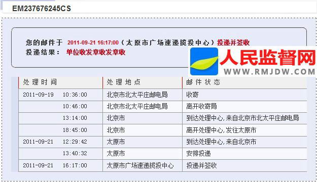 经查询,20119211617分贵部用单位收发章签收了该函件。