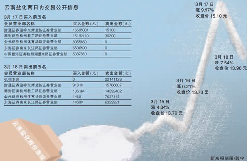 对于盐业股这几日的暴涨暴跌行情,市场甚至出现了游资炒作盐业股的路线图:“一些浙江游资从本周二起就在股市大量买入云南盐化等个股,并在收盘后到浙江各地抢盐,随后又散布谣言,周四游资将云南盐化拉至涨停大幅获利。”