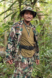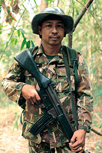 探玛隆•颂萨(Thamarong Somsak)以前在一间印刷厂工作,但他一直向往户外工作。探玛隆的家乡位于曼谷东南省份,那里森林茂密,他自小在森林的怀抱中长大,大自然始终吸引着他。终于有一日,厌倦了印刷厂工作的他来到靠近泰国与柬埔寨边境的Thap Lan国家森林公园。他在那儿找了一份护林员的工作,哪怕薪水只有原来的一半——他原来的月薪是500美元。35岁的銮探隆身上佩戴着佛教护身符,绰号切特(Chate)。他说:“从我还是个小男孩起,大自然就一直是我生命的一部分。我一直梦想着有一天我会来这儿。”