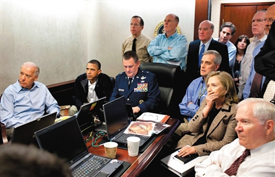 2011年5月2日,美国白宫,美军特种部队在巴基斯坦采取军事行动刺杀本·拉登,奥巴马及其幕僚在白宫通过直播观看行动过程。