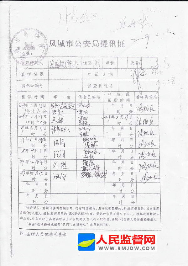 图:冷国权(被改名为“陈东”)的只有提讯时间没有入监回所时间的提讯证