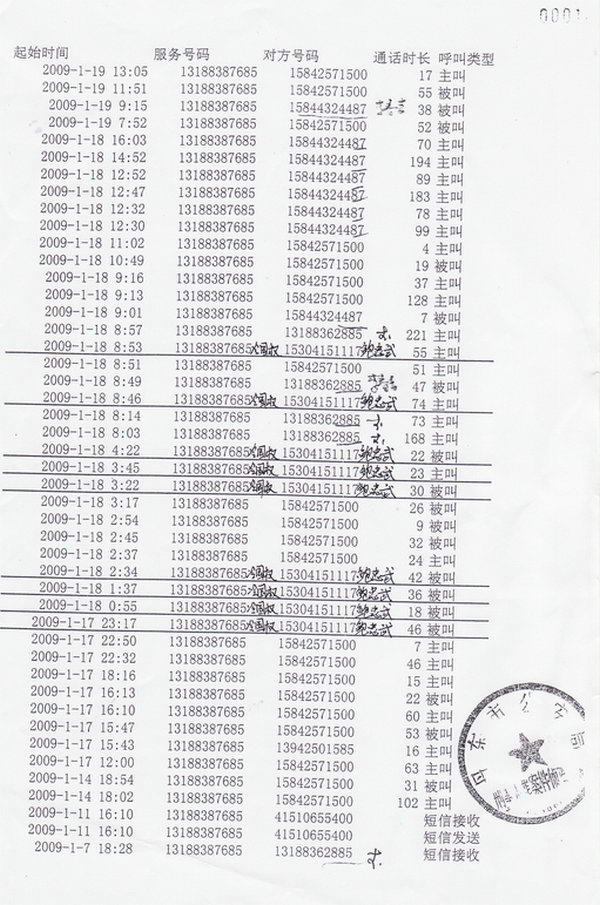 图:丹东市公安局调取的冷国权手机通话单