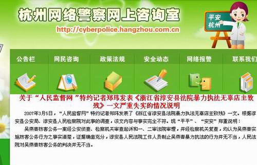背景:《人民监督网》于2007年3月5日、4月2日分别刊登了“浙江淳安法院暴力执法无辜店主致残”,“内幕:<>浙江淳安法官炮制多起冤假错案”等文章。