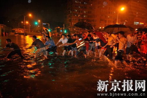因参与抢险工作人员人数不足,许多围观群众自觉协力拉着绳子,努力将车往积水较浅的地方拖拽。