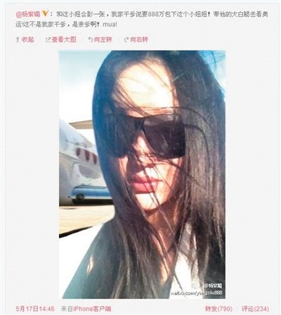 2012年5月,模特杨紫璐在其微博上晒出了一组令网友调侃称“世上只有干爹好”的炫富图文。杨紫璐发帖称,她的干爹要花888万元包机带她直飞伦敦看奥运,随便送的皮包就顶网友两个月工资,引起网友众怒。但杨紫璐本人却不以为然,并称分分钟花888万。“立二拆四”在谈及本次炒作时,曾对杨紫璐说过:“你塑造的炫富干爹的可耻形象会让大家憎恨你,就像陈佩斯的老爸演反面角色一样。”