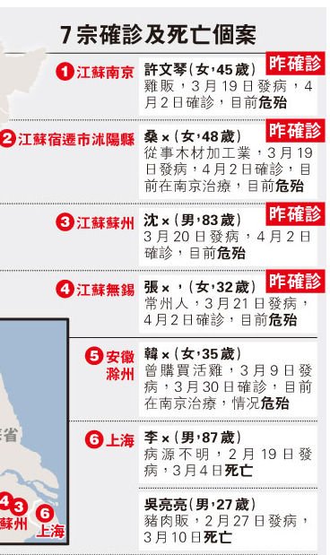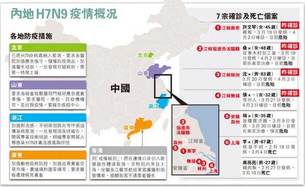 内地H7N9疫情(网络截图) 7宗确诊及死亡个案(网络截图) 原标题:H7N9禽流感病例已达7人 综合新华社电 记者昨日从国家卫生和计划生育委员会获悉,江苏省确诊4例人感染H7N9禽流感病