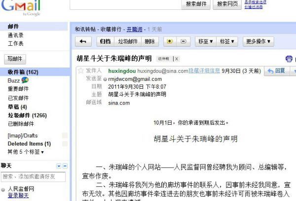 三、2011年9月16日18点23分,胡星斗教授发来手机短信:瑞峰:我的多年好友、原《瞭望》副主编、现北大一个研究院副院长刘东昌教授的亲戚正是那个廊坊秘书长,刘多次找我求情,希望能删除你网站上的帖子。刘与张祖桦、茅于轼都熟,属于我们圈子里的朋友。廊坊方面表示当初性急说了不该说的话,他们绝不会抓捕你的。我认为冤家宜解不宜结,他们既然认错了,你也就得胜收兵吧。也是给我一个面子,我好向朋友交代了。你悄悄撤掉帖子吧,不要声张,给对方一点面子,以上内容都不要上网。下次我们与刘教授见一面,他在北外也兼职带硕士研究生,他跟圈内的民主朋友都很熟。谢谢你,胡