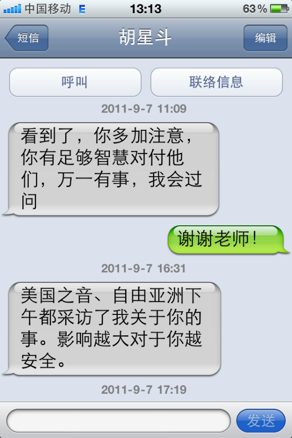 二、2011年9月7日16点31分,胡星斗教授发来手机短信:《美国之音》、《自由亚洲》下午都采访了我关于你的事。影响越大对于你越安全。