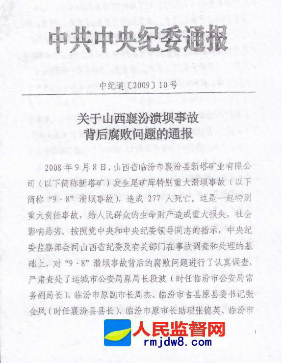 本图:中纪委关于山西襄汾溃坝事故背后腐败问题的通报